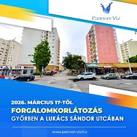 Csatornabekötés meghibásodás miatt 2026. március 24-én, kedden rekonstrukciós munkák kezdődnek Győrben, a Lukács Sándor u 14. szám előtt. Részletek itt...