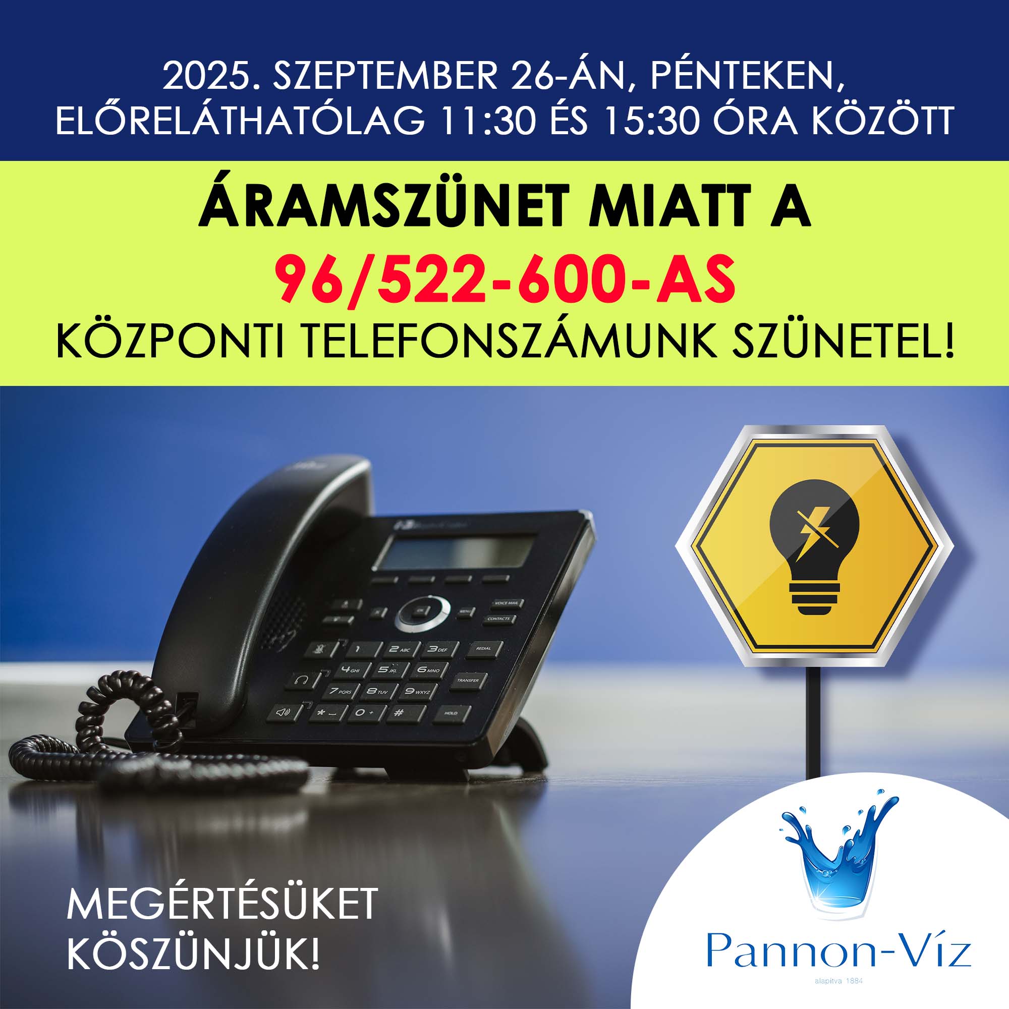 A munkálatok következtében az áramszolgáltatás átmeneti szünetelése várható, ezért 2025. szeptember 26-án, pénteken, előreláthatólag 11:30 és 15:30 óra között a 06-96/522-600-as központi telefonszámunk nem lesz elérhető.