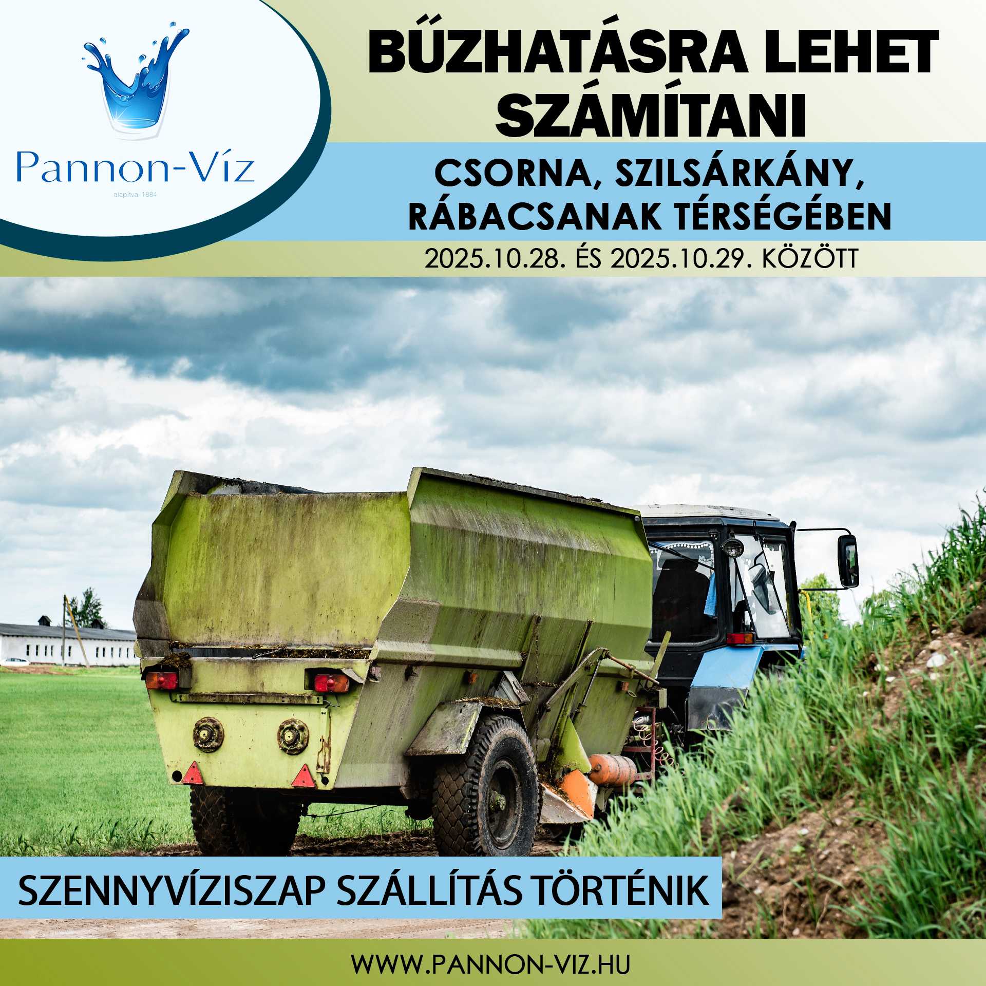 A csornai szennyvíztisztító telepről csapadékmentes időjárás esetén 2025. október 28-tól 2025. október 29-ig terjedő időszakban szennyvíziszap szállítást végez szerződött partnerünk.