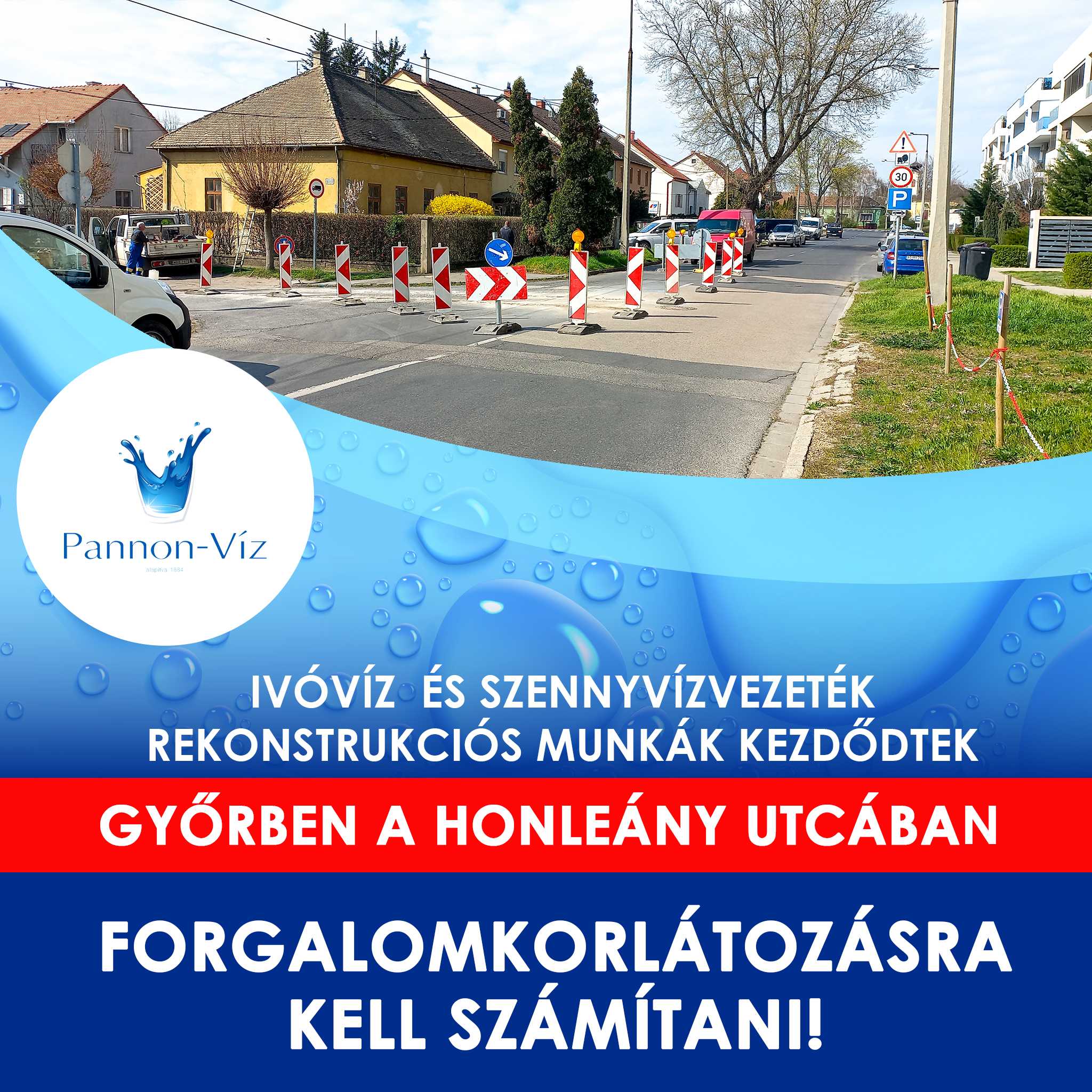 Tájékoztatjuk Tisztelt Felhasználóinkat és az arra közlekedőket, hogy a mai napon ivóvíz‑ és szennyvízvezeték‑rekonstrukciós munkálatok kezdődtek Győrben, a Honleány utcában. A munkavégzés forgalomkorlátozással jár, amely érinti a Kert utca és a Lomb utca felőli kereszteződéseket is.