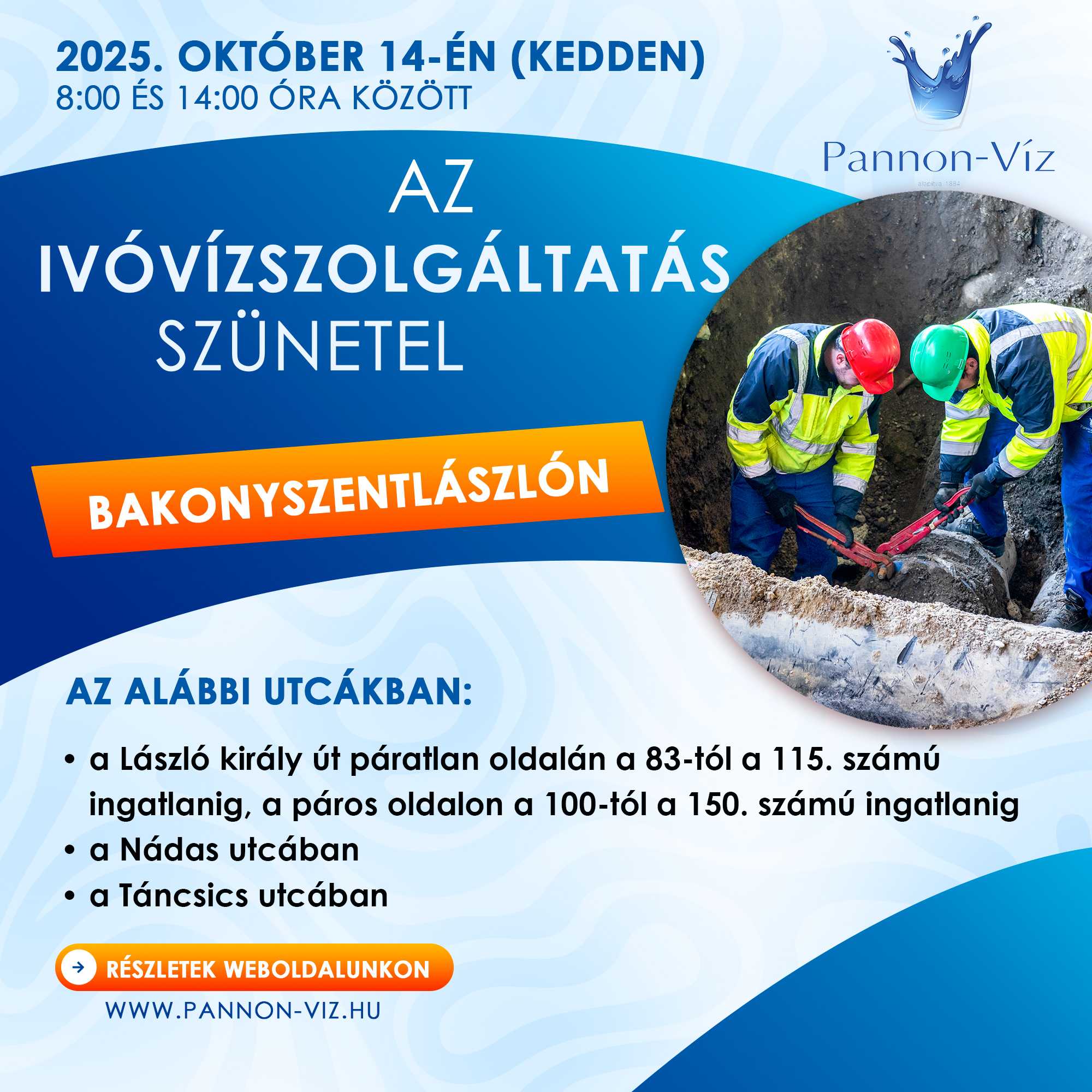 Tájékoztatjuk Tisztelt Felhasználóinkat, hogy társaságunk 2025. október 14-én (kedden) 08:00 és 14:00 óra között hálózatrekonstrukciós munkákat végez Bakonyszentlászló településen, az ivóvízhálózaton.