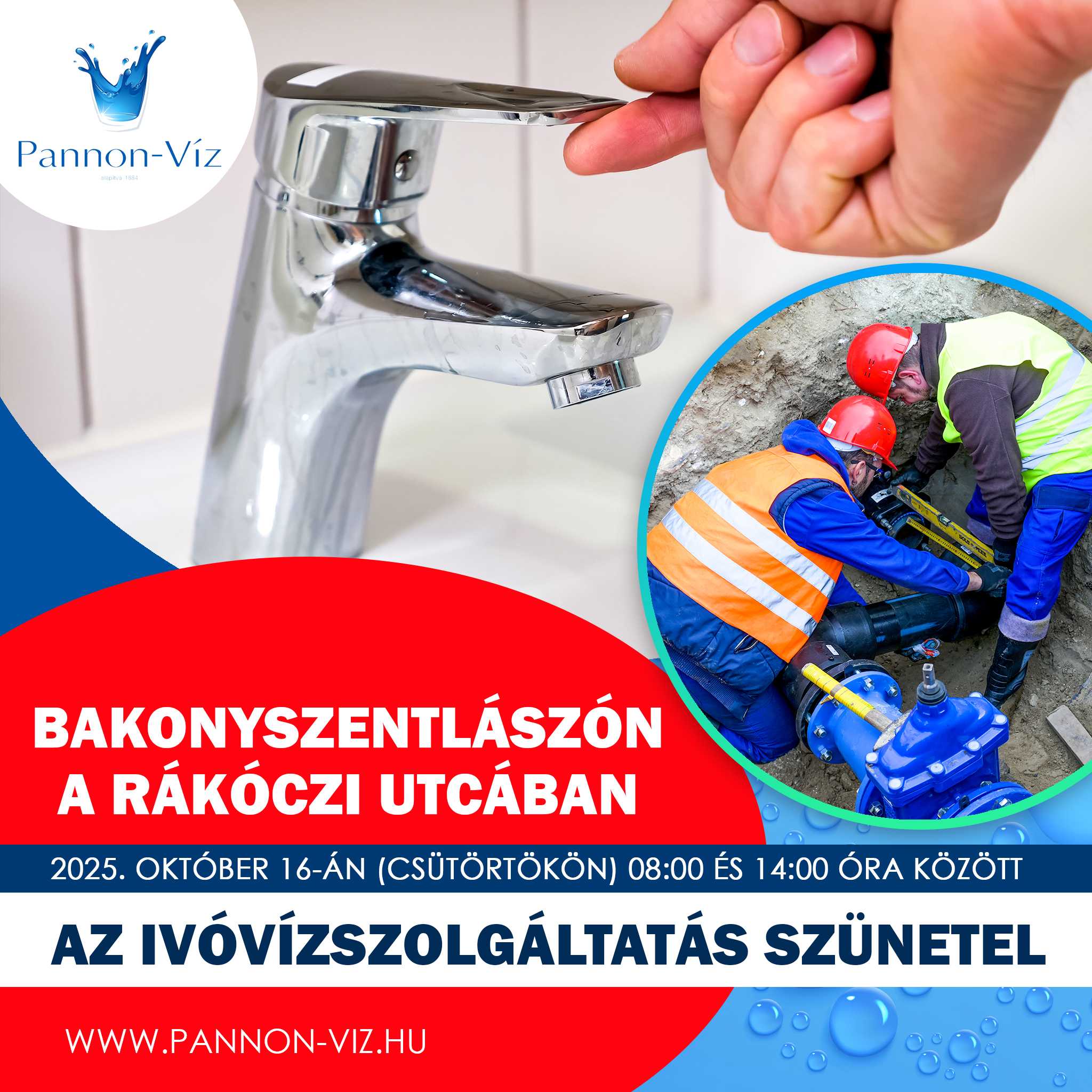 Tájékoztatjuk Tisztelt Felhasználóinkat, hogy társaságunk 2025. október 16-án (csütörtökön) 08:00 és 14:00 óra között hálózatrekonstrukciós munkákat végez Bakonyszentlászló településen, az ivóvízhálózaton.