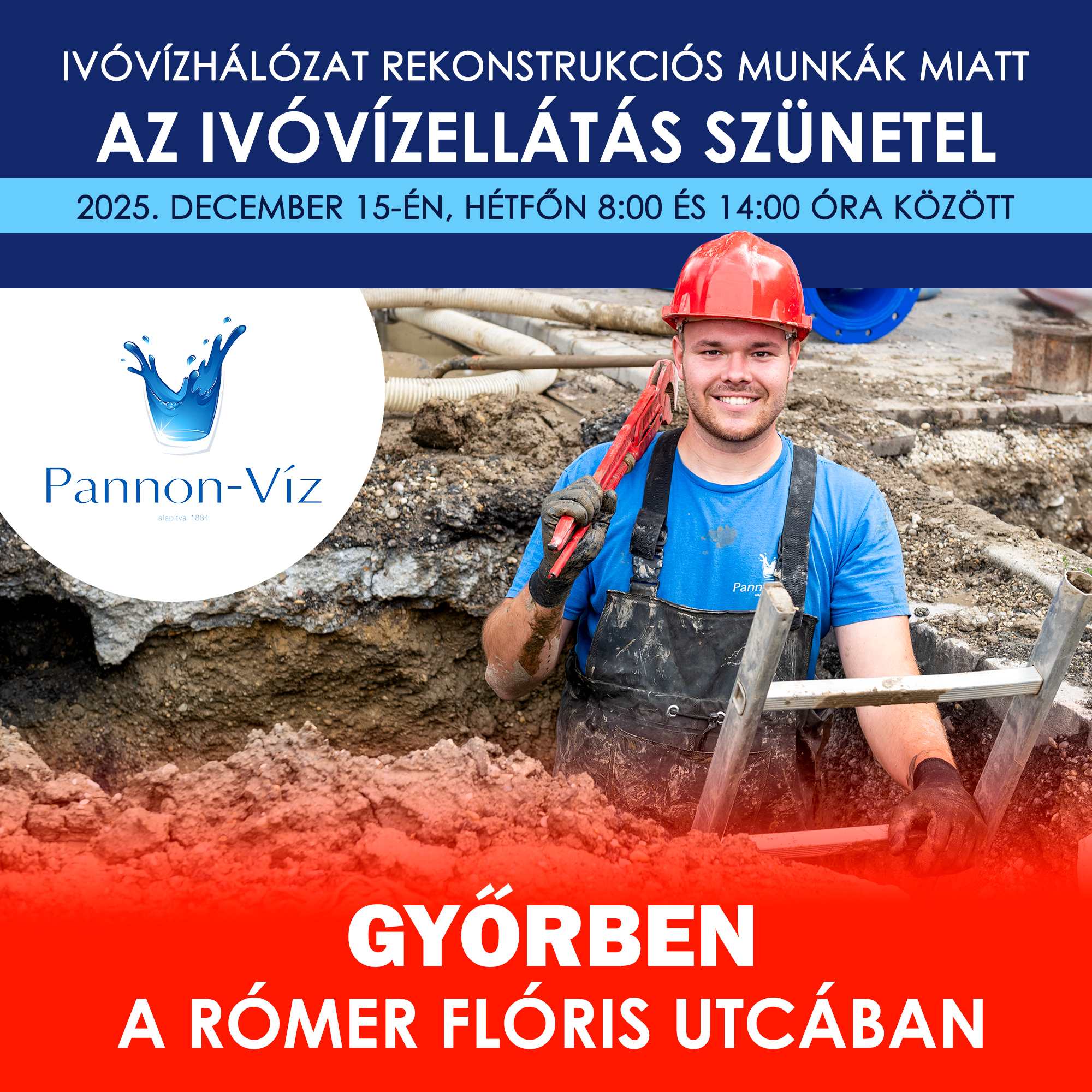 Tájékoztatjuk Tisztelt Felhasználóinkat, hogy társaságunk 2025. december 15-én (hétfőn) ivóvízhálózat rekonstrukciós munkákat végez Győrben a Rómer Flóris utcában.