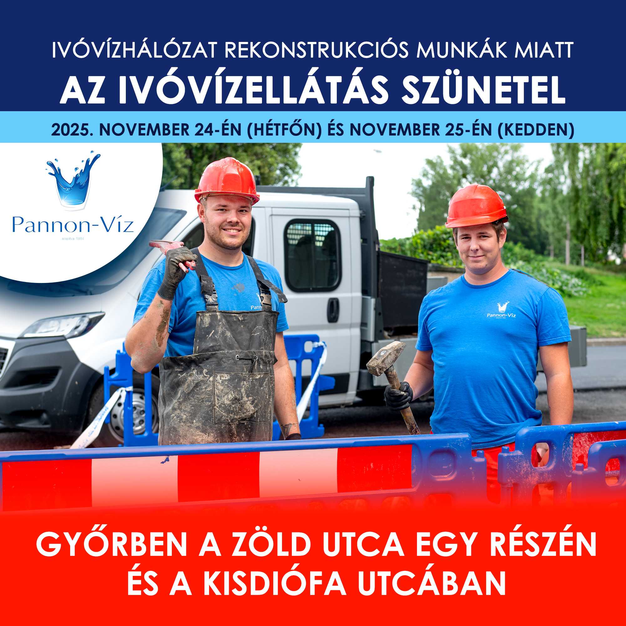 Tájékoztatjuk Tisztelt Felhasználóinkat, hogy társaságunk 2025. november 24-én (hétfőn) és november 25-én (kedden) ivóvízhálózat rekonstrukciós munkákat végez Győrben a Zöld utcában.