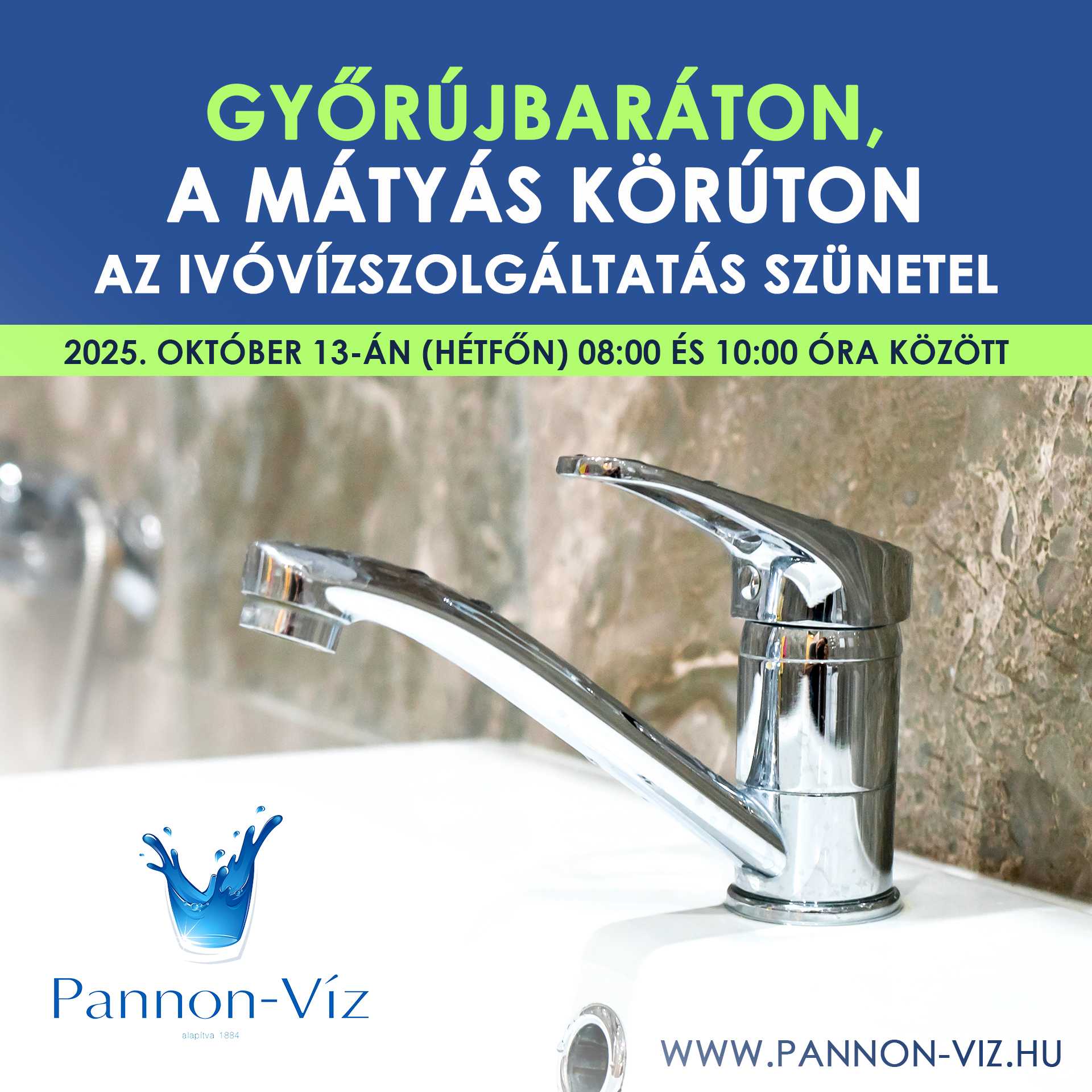 Tájékoztatjuk Tisztelt Felhasználóinkat, hogy társaságunk 2025. október 13-án (hétfőn) 08:00 és 10:00 óra között hibaelhárítási munkákat végez Győrújbaráton, az ivóvízhálózaton.