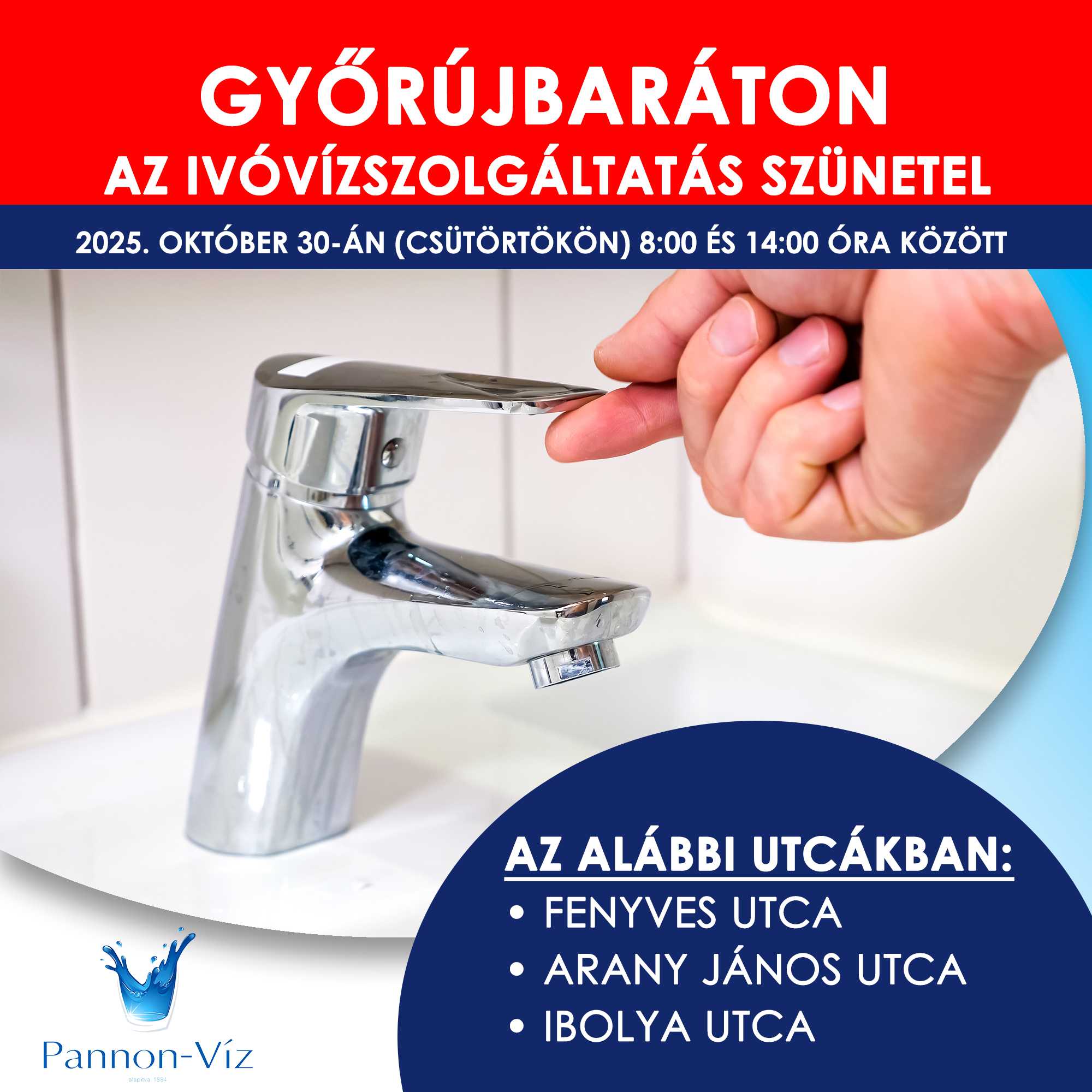 Tájékoztatjuk Tisztelt Felhasználóinkat, hogy társaságunk 2025. október 30-án (csütörtökön) ivóvízhálózat rekonstrukciós munkákat végez Győrújbaráton.