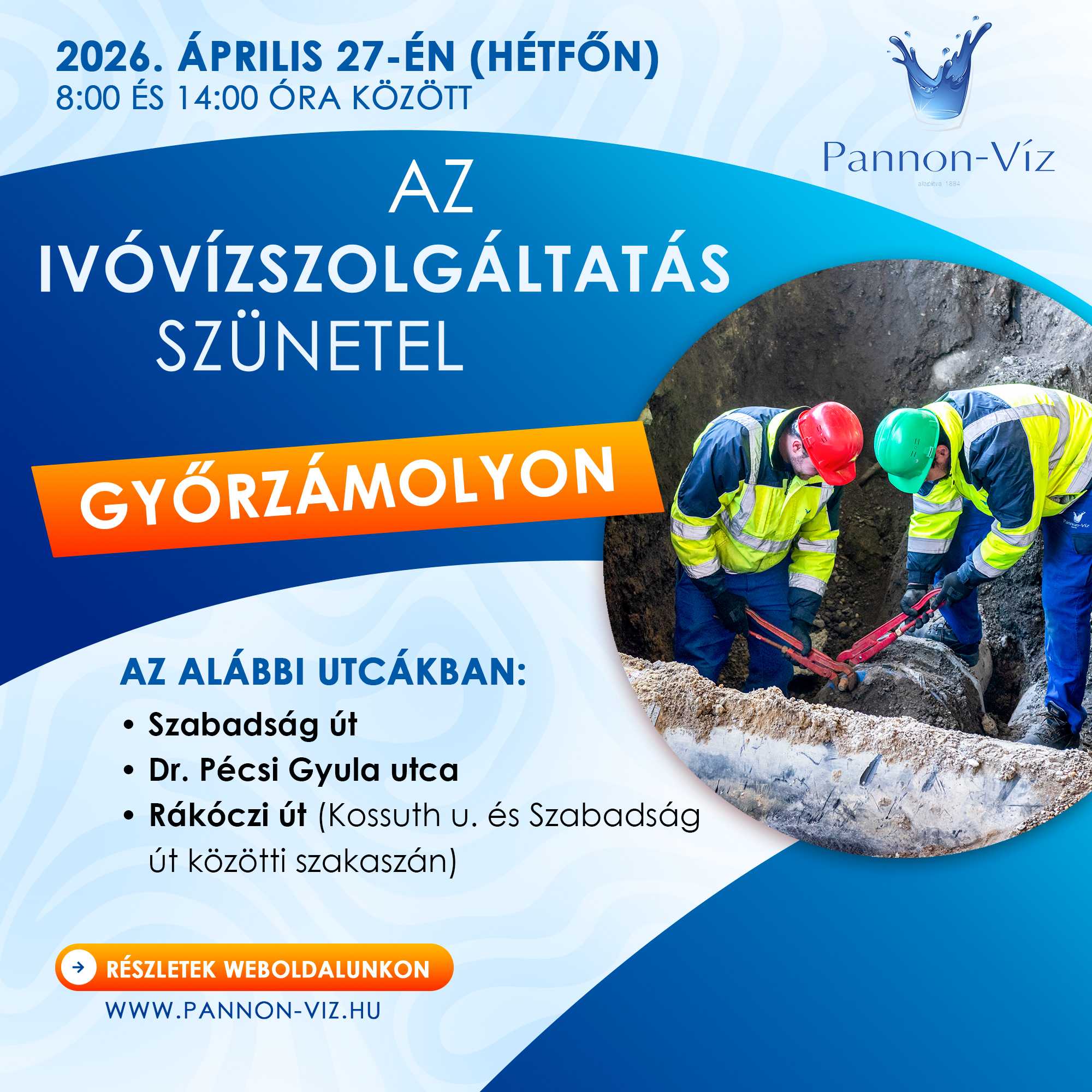 A munkavégzés ideje alatt, 8:00 és 14:00 óra között, az ivóvízszolgáltatás szünetelésére lehet számítani Győrzámolyon a Szabadság úton, a Dr. Pécsi Gyula utcában, valamint a Rákóczi út Kossuth u. és Szabadság út közötti szakaszán.