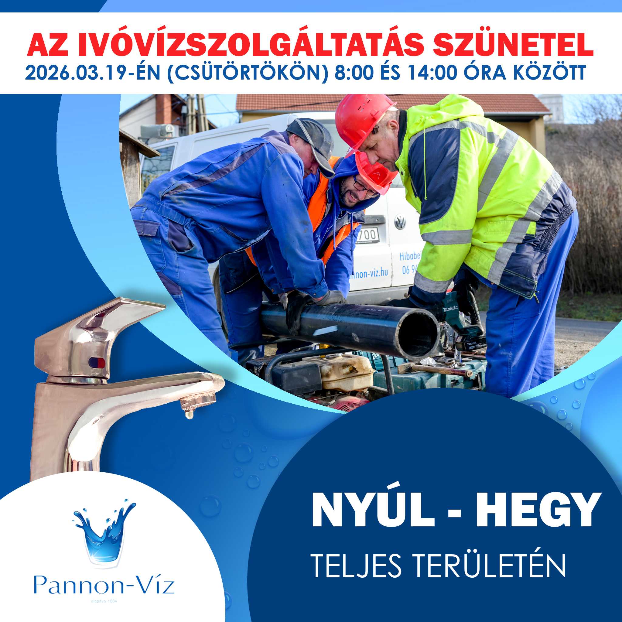 Tájékoztatjuk Tisztelt Felhasználóinkat, hogy társaságunk 2026. március 19-én (csütörtökön) ivóvízhálózat rekonstrukciós munkákat végez Nyúl településen.