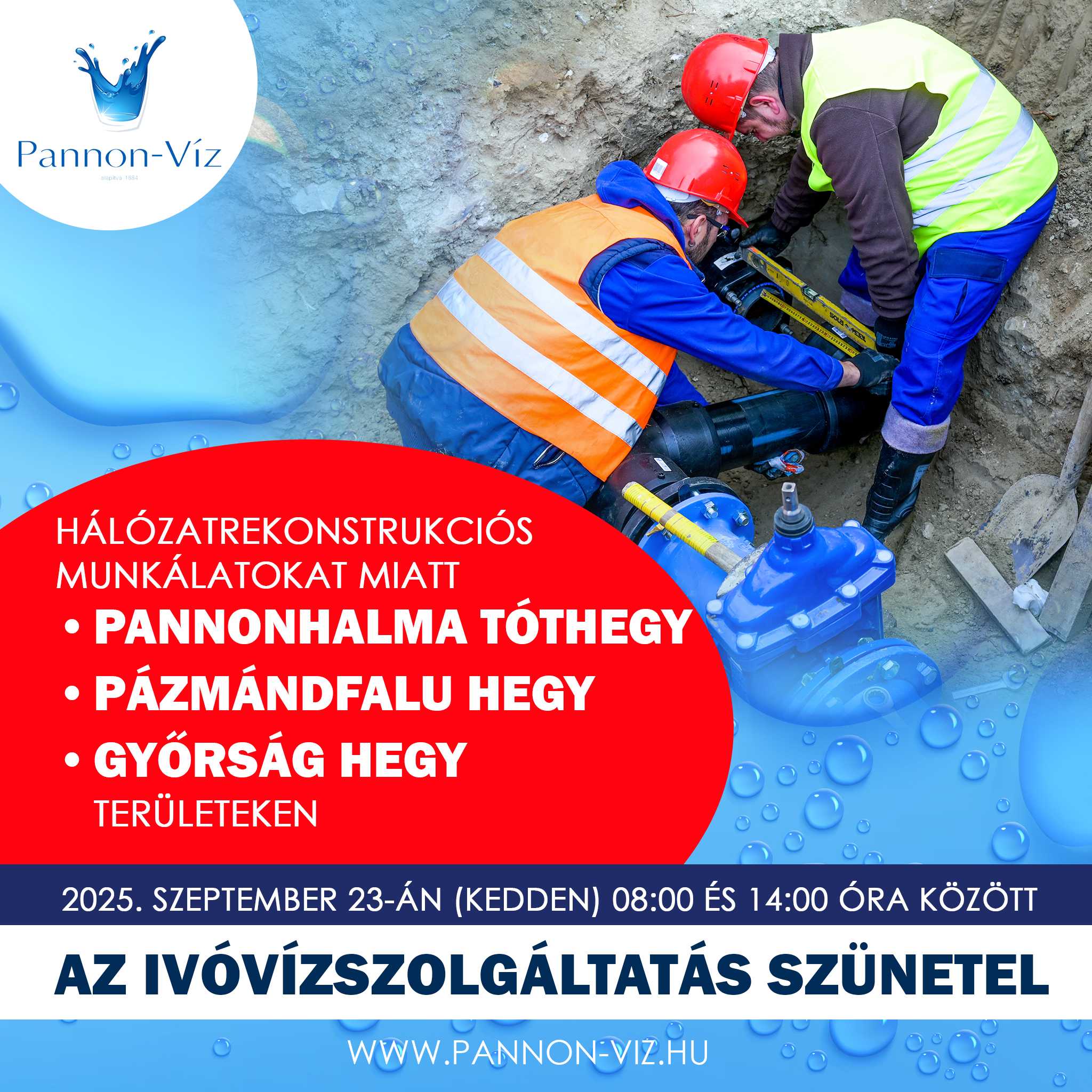 Tájékoztatjuk Tisztelt Felhasználóinkat, hogy társaságunk 2025. szeptember 23-án (kedden) 08:00 és 14:00 óra között hálózatrekonstrukciós munkálatokat végez az ivóvízhálózaton.