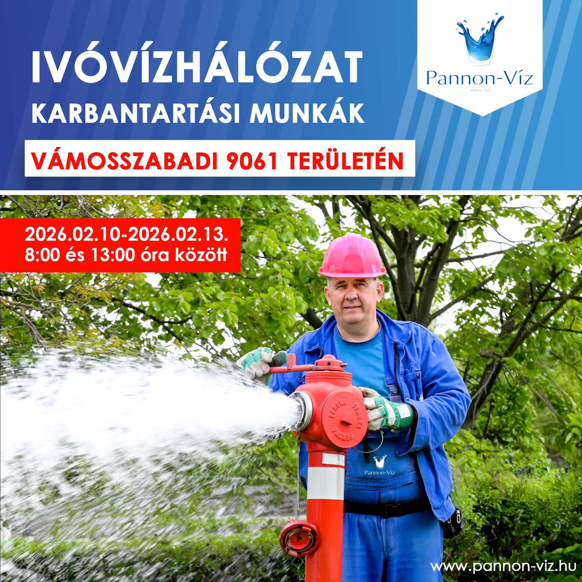 A Pannon-Víz Zrt. 2026. február 10-től (keddtől) február 13-ig (péntekig) minden nap 8:00 és 13:00 óra között vízvezeték-öblítési munkálatokat végez Vámosszabadi 9061 területén a vízminőség megóvása érdekében. A munkavégzés ideje alatt átmeneti nyomásingadozás, vízelszíneződés vagy időszakos vízhiány fordulhat elő.