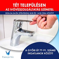 Társaságunk 2026. április 24-én (pénteken) ivóvízhálózat rekonstrukciós munkákat végez Tét településen. A munkavégzés ideje alatt az ivóvízszolgáltatás szünetelésére lehet számítani az alábbi részeken... Részletek itt...