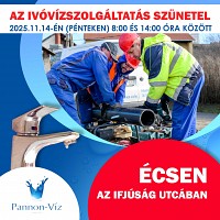 Társaságunk 2025. november 14-én (pénteken) ivóvízhálózat rekonstrukciós munkákat végez Écs településen. A munkálatok miatt 8:00 és 14:00 óra között az ivóvízszolgáltatás szünetelésére kell számítani Écsen az Ifjúság utcában. Részletek itt...